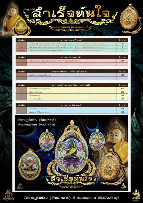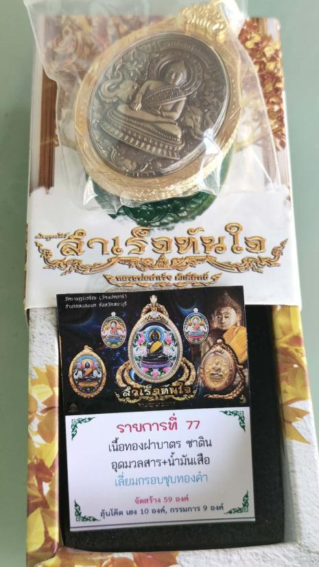 เหรียญพุทธศิลป์หลวงพ่อสำเร็จศักดิ์สิทธิ์ รุ่น"สำเร็จทันใจ" วัดราษฎร์เจริญ จ.สระบุรี เนื้อทองฝาบาตรซาติน หลังอุดมวลสาร+น้ำมันเสือ โค๊ต"เฮง"เลี่ยมกรอบชุบทองคำ หมายเลข ๖๖๖ พร้อมกล่อง โค๊ตเฮงสร้าง10องค์ |