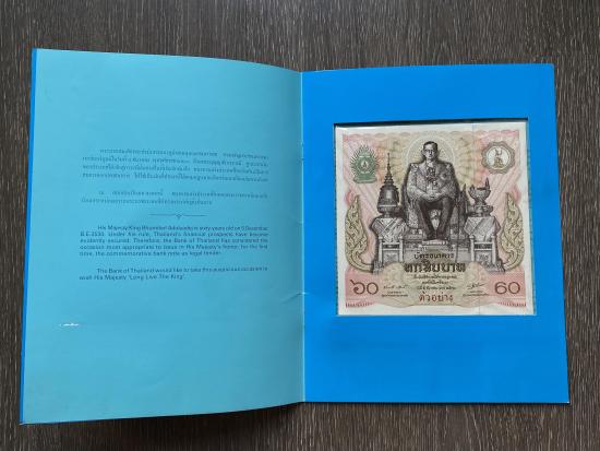 รายละเอียด ธนบัตรตัวอย่าง บัตรธนาคาร 60 บาท ที่ระลึกพระบาทสมเด็จพระเจ้าอยู่หัว รัชกาลที่ 9 เฉลิมพระชนมพรรษาครบ 5 รอบ พร้อมปก