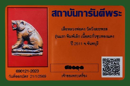 ชื่อพระเครื่อง เสือหลวงพ่อคง วัดวังสรรพรส รุ่นแรก พิมพ์เล็ก เนื้อตะกั่วชุบทองแดง ปี 2511 จ.จันทบุรี พร้อมบัตรG...