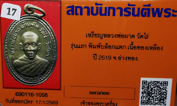 เหรียญหลวงพ่อผาด วัดไร่ รุ่นแรก พิมพ์บล็อกแตก เนื้อทองเเหลือง ห่วงเดิม ปี2519 จ.อ่างทอง + บัตรG-pra สภาพสวยเดิมค่ะ |