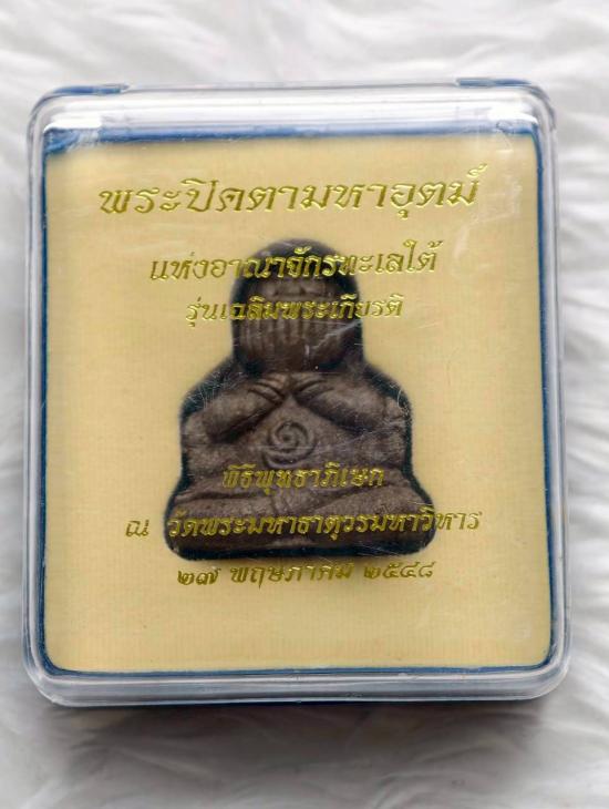 เคาะเดียวแดง พระปิดตามหาอุตม์ แห่งอาณาจักรทะเลใต้ รุ่นเฉลิมพระเกียรติ ปี2548 จัดสร้างโดยวัดมหาธาตุวรมหาวิหาร จังหวัดนครศรีธรรมราช เนื้อผงใบลาน ใต้ฐานบรรจุตะกรุดเงินคู่ ตอกโค้ด และยิงเลเซอร์หมายเลข 731 |