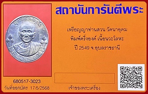 เหรียญญาณท่านสวน วัดนาอุดม พิมพ์ครึ่งองค์ เนื้อนวะ มีบัตรรับรองจีพระ เคาะเดียว