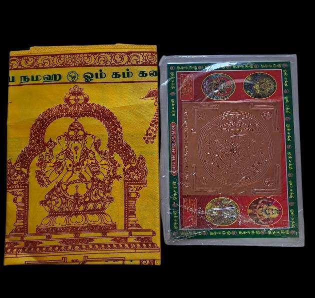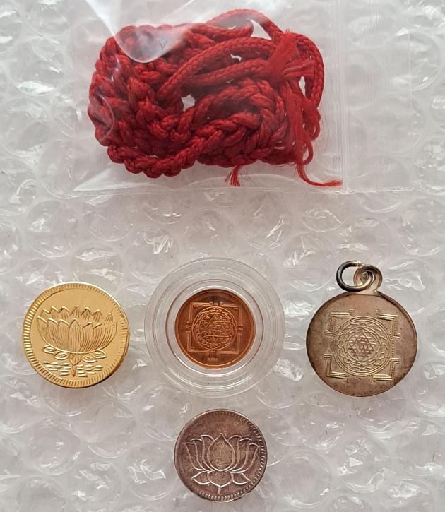 เหรียญพระพิฆเนศ ทองแดงปัดเงาขนาด 1.5 ซม 1 เหรียญ เหรียญนิเกิ้ลแม่พระลักษมี ขนาด 1.5 ซม 1เหรียญ เหรียญบรอนทอง แม่พระลักษมี 2 ซม 1เหรียญ เหรียญนิเกิ้ล แม่พระอุมา ขนาด 2 ซม.พร้อมเชือกแดง 1 เหรียญ แผ่นบูชาหลังทองแดง 1 แผ่น และผ้ายันต์พระพิฆเนศ 1 ผืน