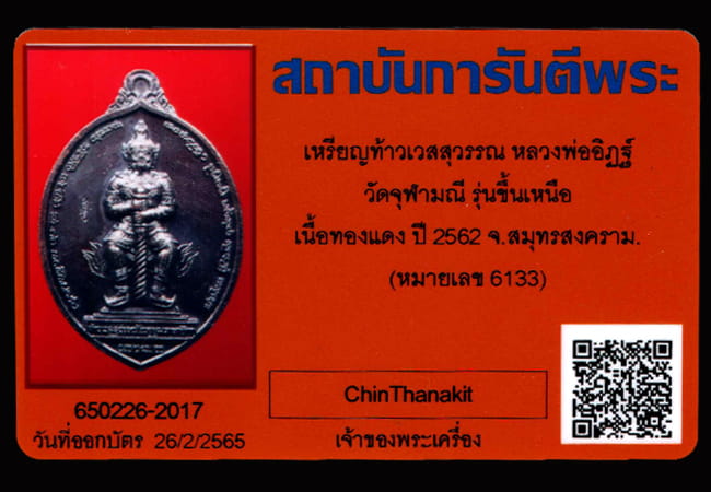 เหรียญท้าวเวสสุวรรณ วัดจุฬามณี รุ่น ขึ้นเหนือ เนื้อทองแดง (หมายเลข 6133) ปี2562 พร้อมบัตร QR-Code |