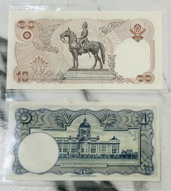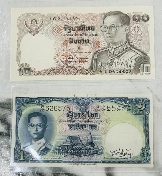 ชุด 2 ใบ ธนบัตร 10 บาท ร.9 หลังพระบรมรูปทรงม้า และ 1 บาท โทมัส ลายน้ำพาน