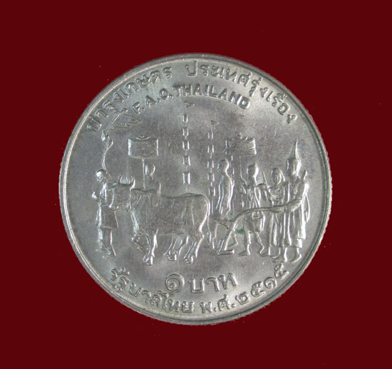 เหรียญกษาปณ์ 1 บาท พระราชพิธีแรกนาขวัญ บำรุงเกษตร ประเทศรุ่งเรือง FAO. รุ่นแรก ปี 2515 ไม่ผ่านการใช้