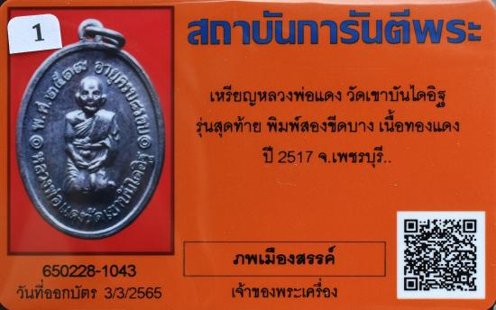เหรียญคุกเข่า รุ่นสุดท้าย พิมพ์สองขีดบาง เนื้อทองแดง ปี 2517 หลวงพ่อแดง วัดเขาบันไดอิฐ จ.เพชรบุรี + บัตรรับรองพระแท้การันตีพระ สภาพพระตามรูปที่ลงทุกประการ