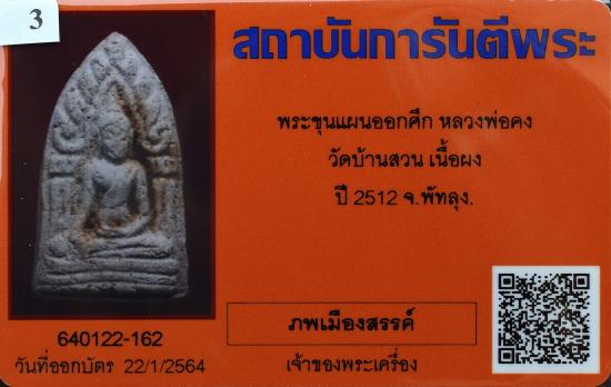 ( 3 ) พระผงบารมีคงไชยชุม พิมพ์พระขุนแผนออกศึก อ.ชุม ไชยคีรี , หลวงพ่อคง วัดบ้านสวน เนื้อผง ปี 2513 จ.พัทลุง ( มวลสารรุ่นนี้เข้มขลังมาก ) มาพร้อมบัตรรับรองพระแท้การันตีพระ สภาพพระตามรูปที่ลงทุกประการ (ขนาดประมาณ 3.5 x 2 ซม.)