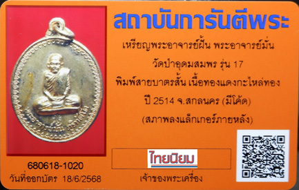เหรียญพระอาจารย์ฝั้น อาจาโร ปี 2514 รุ่น17 พิมพ์พระอาจาร์ยมั่น กะไหล่ทอง ตอกโค๊ด "กรรมการ" พบเจอน้อย หายาก + บัตรรับรอง G-PRA