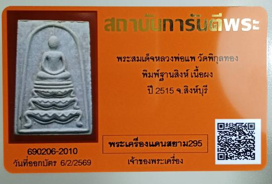 พระสมเด็จฐานสิงห์ เนื้อผงเกสรบรรจุตะกรุด ๓ กษัตริย์ อนุสรณ์จากสิงหล ประเทศศรีลังกา หลวงพ่อแพ วัดพิกุลทอง ปลุกเสกเดี่ยวตลอดไตรมาส พ.ศ.๒๕๑๕ จัดพิธีพุทธาภิเษกใหญ่ในวันเสาร์ที่ ๒๑ ตุลาคม ๒๕๑๕ ตรงกับวันขึ้น ๑๔ ค่ำ เดือน ๑๑ ปี ชวด อนุสรณ์จากเมืองแคนดี้ สาธารณรัฐศรีลังกา ในวาระที่หลวงพ่อแพท่านได้เดินทางไปนมัสการพระทันตธาตุ-พระเขี้ยวแก้วของสมเด็จพระบรมศาสดาสัมมาสัมพุทธเจ้า |