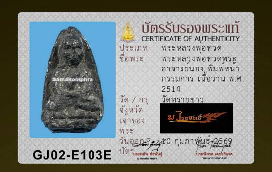 มีบัตรรับรองพระแท้ หลวงพ่อทวด อาจารย์นอง วัดทรายขาว ปี 2514 เนื้อว่านหน้ากรรมการ