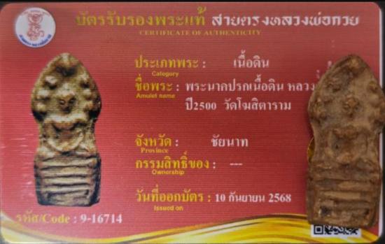 พระนาคปรกเนื้อดิน ยุคต้น หลวงพ่อกวย วัดโฆสิตาราม จ.ชัยนาท ปี2500 พร้อมใบประกาศรางวัลที่1 +บัตรรับรองฯ