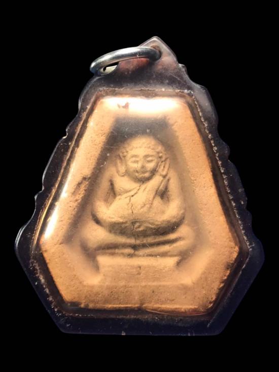 พระปิดตาหกเหลี่ยม หลังสังกัจจายน์ เนื้อผงพุทธคุณ หลวงปู่เฮี้ยง วัดป่าฯ พร้อมเลี่ยมกรอบกันน้ำ
