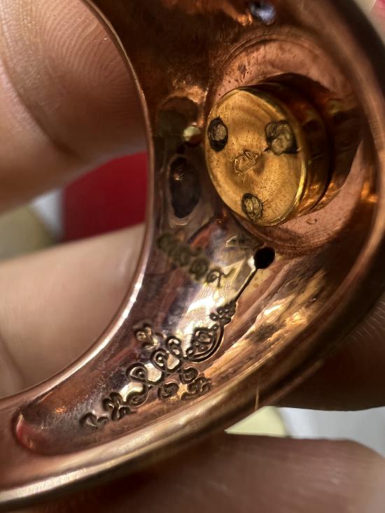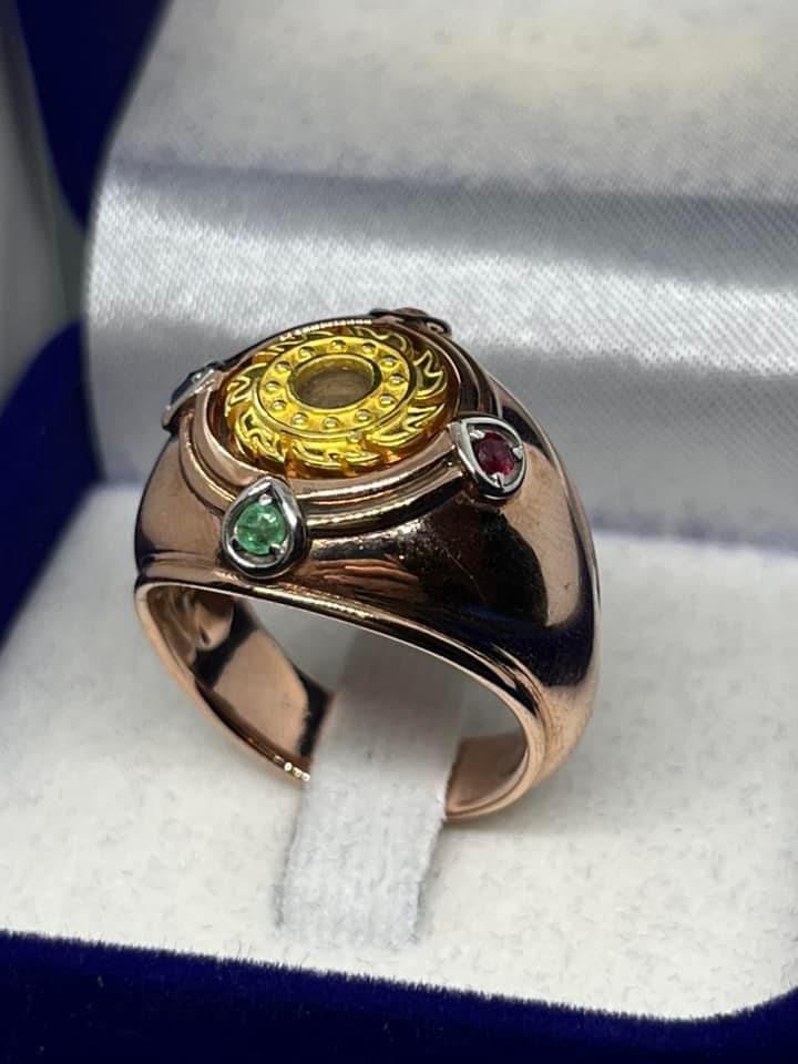 พรหมประสิทธิ์ แหวนมหาจักร มวลสารร้อยล้าน เนื้อสัตตะชุบพิงค์โกล์ จักรมวลสาร ฝังอัญมณี ทับทิม,ไพลิน,บุษราคัม,มรกต ของเสี่ย อั๋น โอกิ จักรหมุนได้ มวลสารร้อยล้านบาท หมายเลขสวย ๒๖๓๒เส้นผ่าศูนย์กลางวงในขนาด