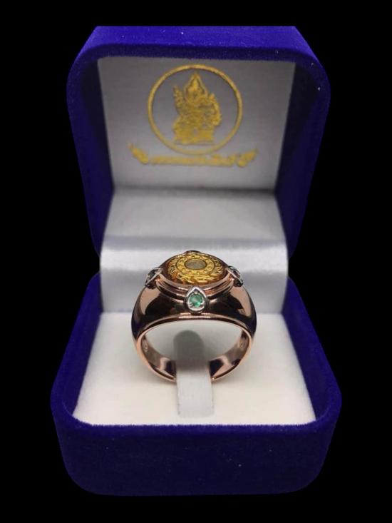 พรหมประสิทธิ์ แหวนมหาจักร มวลสารร้อยล้าน เนื้อสัตตะชุบพิงค์โกล์ จักรมวลสาร ฝังอัญมณี ทับทิม,ไพลิน,บุษราคัม,มรกต ของเสี่ย อั๋น โอกิ จักรหมุนได้ มวลสารร้อยล้านบาท หมายเลขสวย ๒๖๓๒เส้นผ่าศูนย์กลางวงในขนาด 2.2 เซนติเมตร ไซค์ประมาณ62 กล่องเดิม