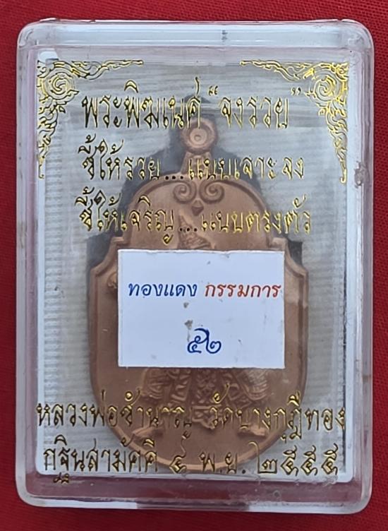 เหรียญพระพิฆเนศ "จงรวย"เนื้อทองแดงพ่นทราย กรรมการพร้อมรอยจาร ปี 2555 ตอกโค้ต และ หมายเลข52 หลวงพ่อชำนาญ วัดบางกุฎีทอง |