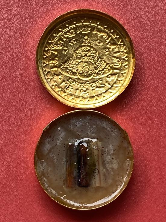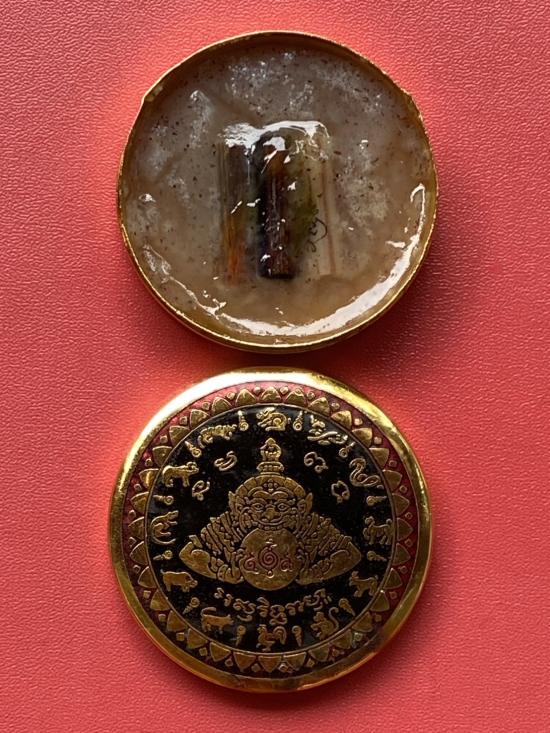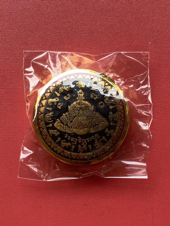 เคาะเดียวแดง สีผึ้งพระราหู รุ่น มงคลจักรวาล เนื้อ โลหะชุบทองลงยาสีดำขอบสีแดง ขนาด5ซม |
