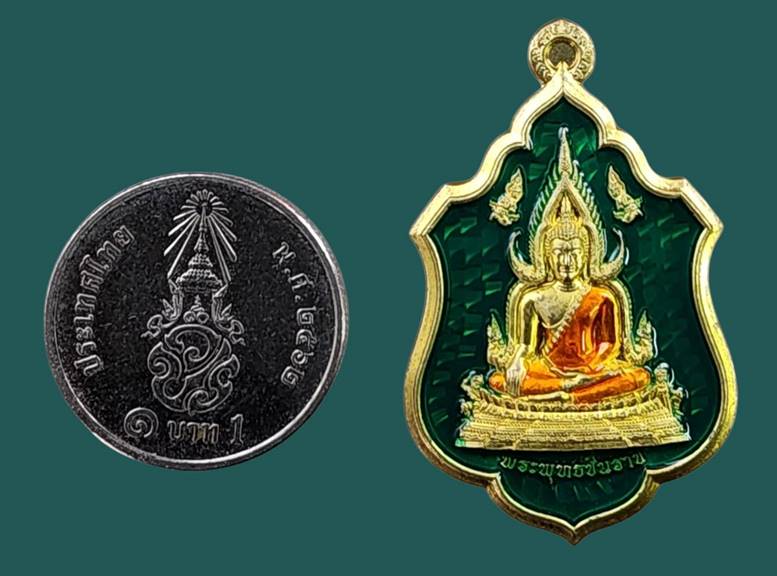 ( เลข 1365 ) เหรียญโล่ห์พระพุทธชินราช หลังยันต์วิเศษอกเลาโภคทรัพย์ เนื้อทองทิพย์ลงยาสีเขียว เหนี่ยวทรัพย์ รุ่น สมโภชพระพุทธชินราช ครบ ๖๖๖ ปี |
