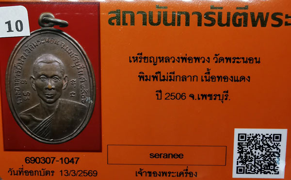 เหรียญหลวงพ่อพวง วัดพระนอน พิมพ์ไม่มีกลาก เนื้อทองแดง ห่วงเดิม ปี2506 จ.เพชรบุรี + บัตรG-pra สภาพเดิมค่ะ |