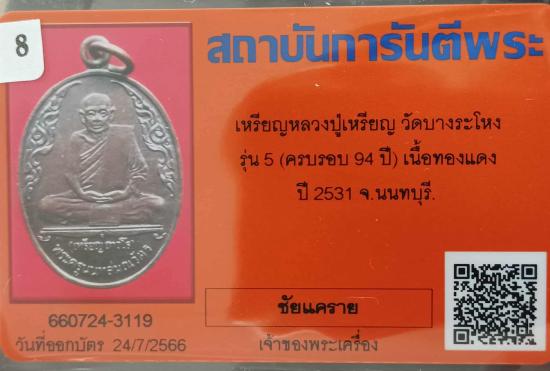 เหรียญรูปไข่ เนื้อทองแดง รุ่นสุดท้าย (5) หลวงปู่เหรียญ วัดบางระโหง นนทบุรี มาพร้อมบัตรจี #8