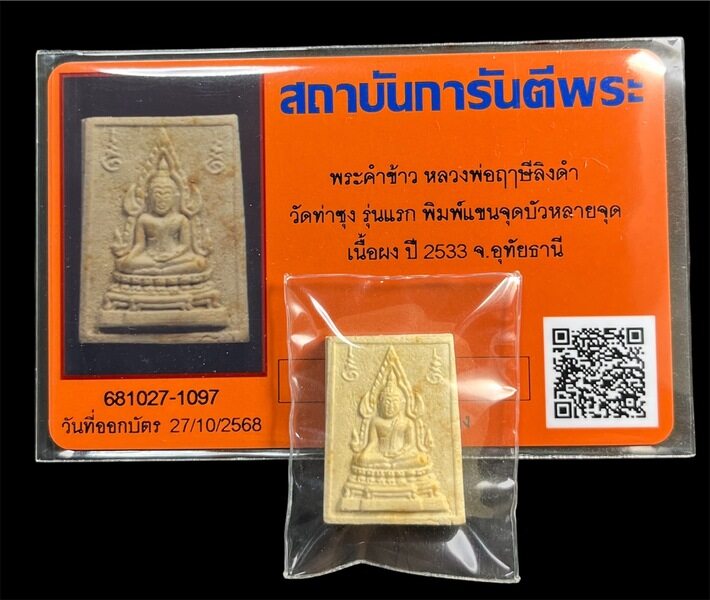 พระคำข้าว หลวงพ่อฤาษีลิงดำ วัดท่าซุง รุ่นแรก พิมพ์แขนจุดบัวหลายจุด(นิยมสุด) เนื้อผง ปี 2533 จ.อุทัยธานี องค์จริงสภาพสวยมาก เนื้อเนียนละเอียด พร้อมบัตรรับรองจากสถาบันการันตีพระ