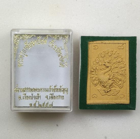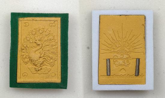 1.พญานกยูงทอง รุ่นแรก ฝังตะกรุดคู่ด้านหลัง เนื้อผงพุทธคุณ เด่นทางด้าน แมตตามหานิยม ความรัก คู่ครอง