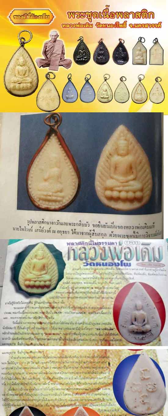 พระพุทธเนื้อพลาสติก สภาพสวยสมบูรณ์ เป็นวัตถุมงคลหลวงพ่อเดิม ที่มีราคาเบาที่สุด ตามประวัติ ในช่วงหลังสงครามโลก โลหะที่ใช้ทำพระไม่มีและหายาก แต่ความต้องการวัตถุมงคลของหลวงพ่อเดิม มีมาก จึงได้สั่งทางโรงงานทำส่งมา เพื่อทำการแจกลูกศิษย์ที่มีจำนวนมาก มีหลากหลายแบบ (พระพุทธ , นางกวัก , หลวงพ่อเดิม) เป็นเนื้อพลาสติกสีดำ สีเหลือง สีขาว