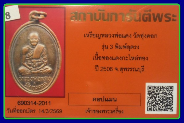บัตรการันตี-800- เหรียญหลวงพ่อแดง วัดทุ่งคอก จ.สุพรรณบุรี รุ่น 3 พศ.2506 |