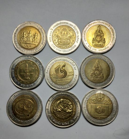 เหรียญ10บาทสองสี รัชกาลที่9มีหลายวาระมี9เหรียญมีซ้ำกัน1เหรียญ ชอบเชิญเคาะได้ครับ |