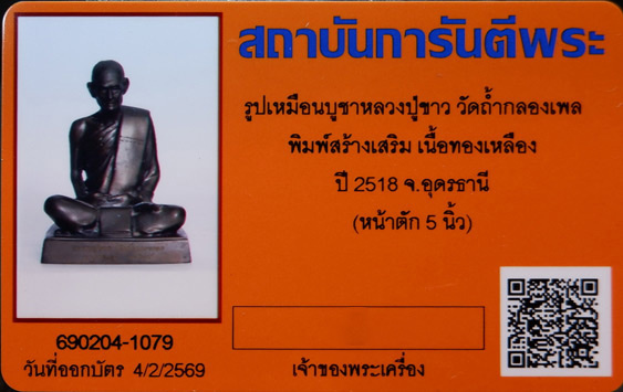 พระบูชารูปเหมือนหลวงปู่ขาว วัดถ้ำกลองเพล รุ่นสาม ปี 2518 จ.อุดรธานี เนื้อทองเหลือง หน้าตัก 5นิ้ว บัตรรับรอง GPRA