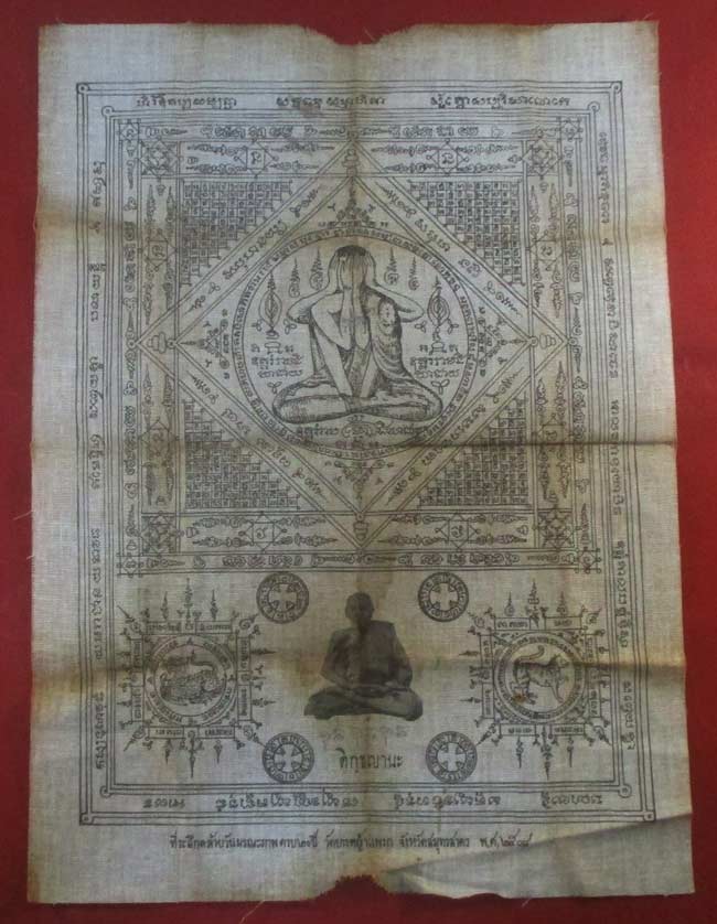 ผ้ายันต์ ที่ระลึกวันมรณะภาพครบ ๒๐ ปี หลวงพ่อสาย วัดบางหญ้าแพรก จ.สมุทรสาคร พ.ศ. ๒๕๐๘ ครับ (พระบ้าน ครับ) |