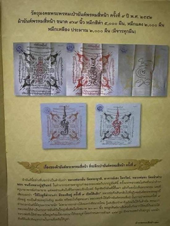 ผ้ายันต์พรหมสี่หน้า งานเป่ายันต์พรหมสี่หน้าครั้งที่ 9 ประจำปี พ.ศ.๒๕๕๒ มีจาร ขนาดประมาณ9*9นิ้ว ปั้มตราวัดตอกเลขทุกผืน สภาพเดิมๆ |