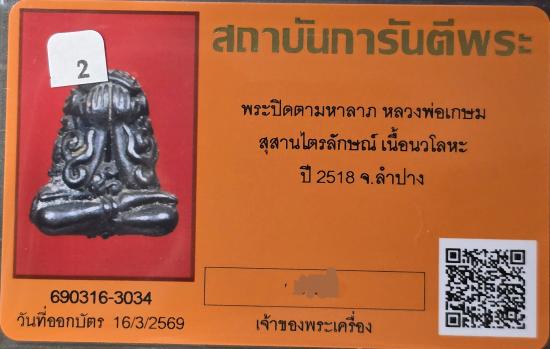 พระปิดตามหาลาภ ปลุกเสกโดยหลวงพ่อเกษม เขมโก ปี พ.ศ. 2518 เนื้อนวะโลหะ