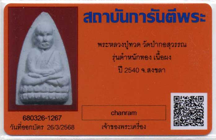 หลวงปู่ทวด รุ่นตำหนักทอง หลวงปู่ทอง สุสังวโร วัดป่ากอสุวรรณาราม อ.นาหม่อม จ.สงขลา ปี2540 เนื้อผงขาว พร้อมบัตร สุดคุ้ม