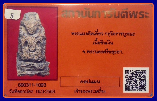 บัตรการันตี-500-พระร่วงนั่ง แผง21 ตัดเดี่ยว เนื้อชินเงิน กรุวัดราชบูรณะ จ.อยุธยา |