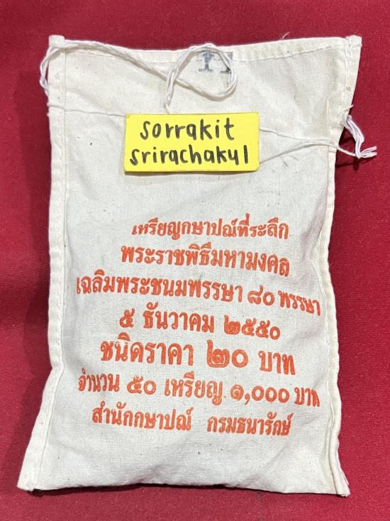 เหรียญ 20 บาทที่ระลึกพระราชพิธีมหามงคลเฉลิมพระชนมพรรษา 80 พรรษา ๕ ธันวาคม ๒๕๕๐ ยกถุง 50 เหรียญ อยู่ในถุงผ้าเดิมๆจากกรมธนารักษ์ ยังไม่เคยเปิดปากถุง สวยงาม หายาก น่าสะสม