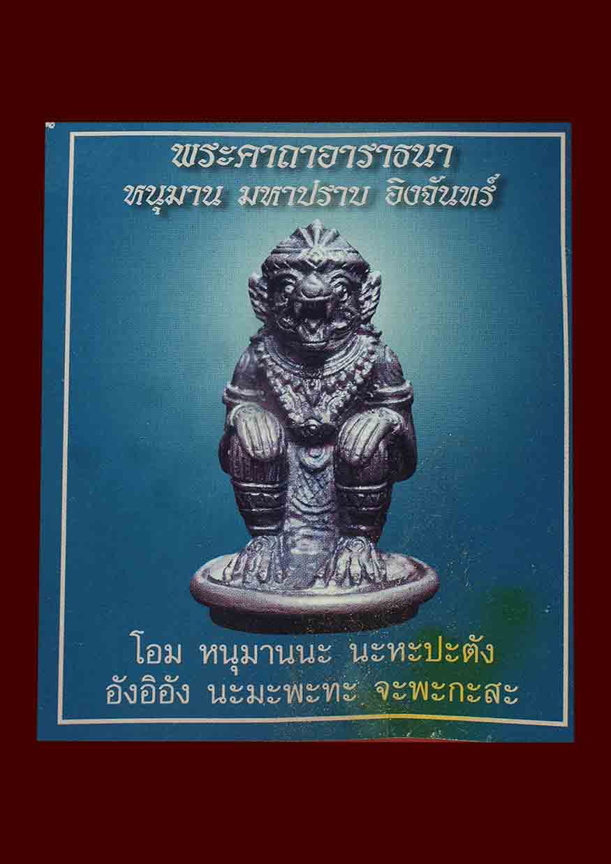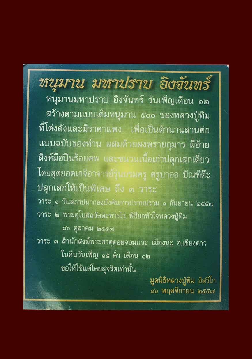 หนุมานมหาปราบ อิงจันทร์ ผสมผงพรายกุมาร หลวงปู่ทิม วัดละหารไร่ จ.ระยอง ทาทอง ปี 2557 ปลุกเสก 3 วาระ ขนาดความสูง 1.1 นิ้ว จัดสร้างโดย มูลนิธิหลวงปู่ทิม วัดละหารไร่ พร้อมซองเดิม และคาถาบูชา |