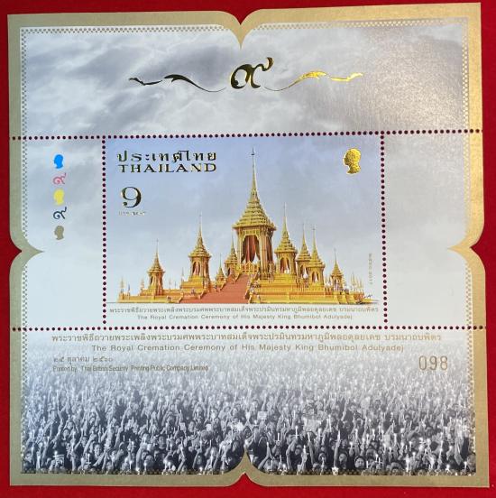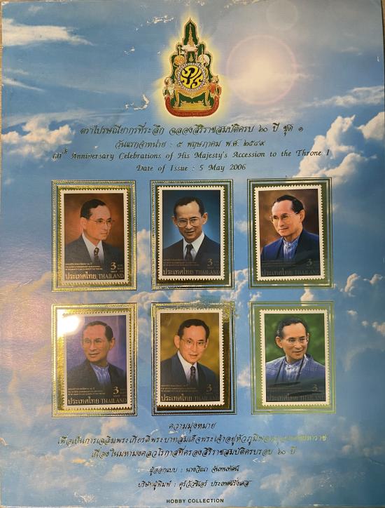 แผ่นชีตแสตมป์ที่ระลึกฉลองสิริราชสมบัติครบ 60 ปี และพระราชพิธีถวายพระเพลิง รวม 3 แผ่นชีต สภาพใหม่ (Mint Never Hinged - MNH) ยังไม่ผ่านการใช้งาน