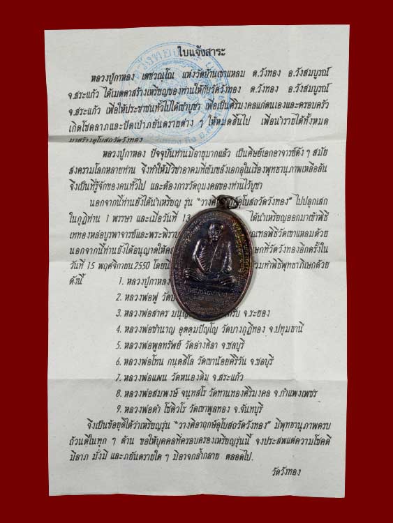 100 เดียวคับ เหรียญหลวงปู่กาหลง วางศิลาฤกษ์ อุโบสถ วัดวังทอง ปี50 พร้อมใบสาระ |