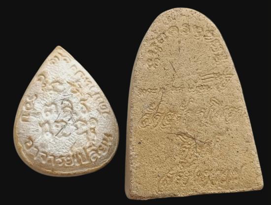 พระผงใบโพธิ์ พระอาจารย์เปลี่ยน ปัญญาปทีโป + พระผงพิมพ์เตารีด พระอาจารย์เปลี่ยน พิมพ์ใหญ่ เนื้อสีเหลือง โรยเส้นเกศาด้านหลัง ฝังข้าวสารดำ สภาพสวยเก็บเดิม ๆ