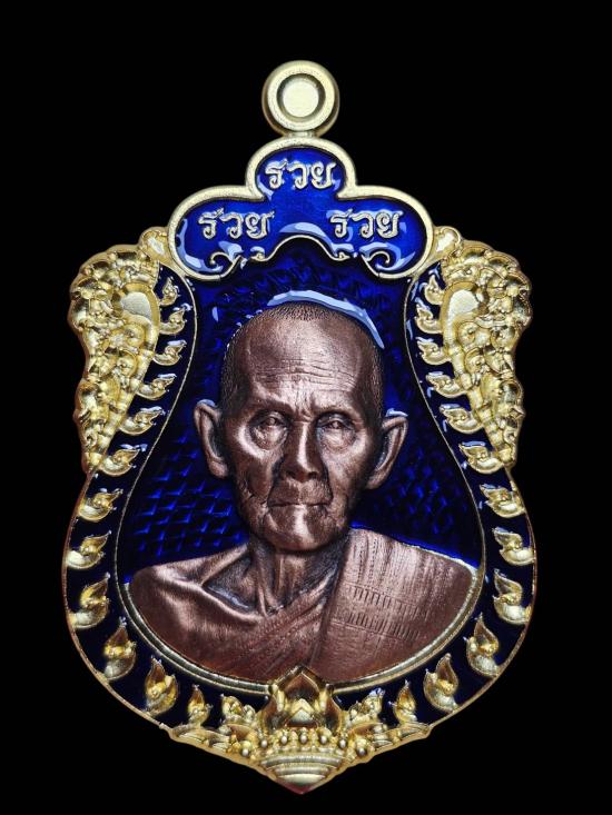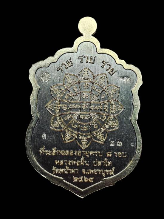 เหรียญเสมา8รอบรุ่นรวยรวยรวย หลวงปู่ฝั้น ปสาโท วัดหน้าผา (เนื้ออาบทอง หน้ากากทองแดงซาตินลงยาพื้นน้ำเงินเลข23)