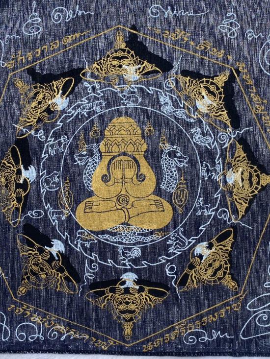 เคาะเดียวแดง ผ้ายันต์ พังพระกาฬ เสริมดวง อุดมมงคล รุ่นมงคลจักวาล ขนาด30/30ซม มีตราประทับ สีดำ |