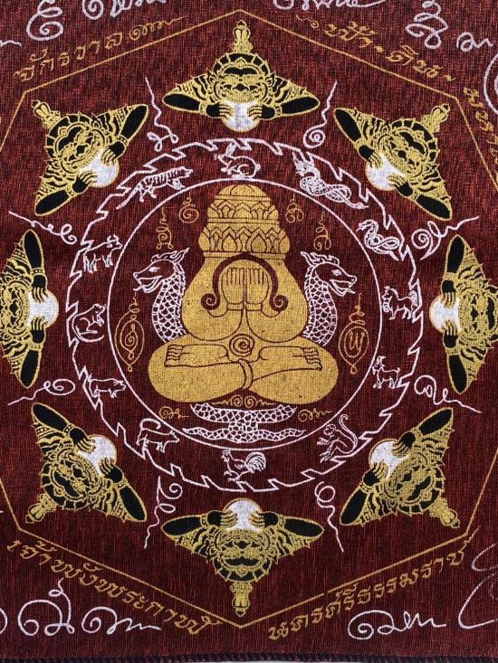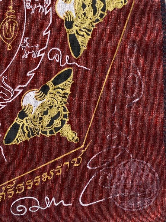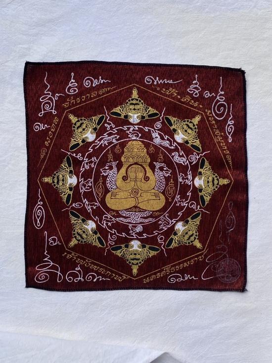 เคาะเดียวแดง ผ้ายันต์ พังพระกาฬ เสริมดวง อุดมมงคล รุ่นมงคลจักวาล ขนาด30/30ซม มีตราประทับ สีแดง |