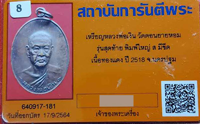 เหรียญ"รุ่นสุดท้าย" หลวงพ่อเงิน วัดดอนยายหอม ปี ๒๕๑๘ (นิยม-ส.ขีด) ..***พิเศษ ตอกหมายเลขไทย ๑๒..สำหรับเหรียญรุ่นนี้สร้างขึ้นในปีพ.ศ.๒๕๑๘..สร้างโดยมูลนิธิสุขศาลานุเคราะห์นครปฐม มีการสร้างหลายเนื้อ เช่น ทองคำ,เงิน ,นวโลหะ และทองแดง สำหรับเนื้อพิเศษอย่างเนื้อนวโลหะและเนื้อเงินนั้น มีทั้งแบบตอกหมายเลขประจำเหรียญและไม่ตอกหมายเลข โดยเหรียญที่นำไปออกให้เช่าที่วัดพระปฐมเจดีย์ฯ ในช่วงปี ๒๕๒๐ ได้มีการนำไปตอกหมายเลขเพื่อแยกจากชุดที่ออกจากวัดดอนยายหอมโดยตรง ซึ่งในชุดที่ตอกเลขไทยจะพบเจอน้อยมาก..สำหรับเหรียญรุ่นนี้ถือเป็นหนึ่งในเหรียญยอดนิยมและเป็นที่รู้จักกันอย่างกว้างขวางของหลวงพ่อเงิน วัดดอนยายหอม ..เหรียญนี้สภาพสวยเดิมๆ..และตอกเลขไทยพบเจอน้อยมากนานๆเจอที..ประสบการณ์ผู้ที่บูชาต่างบอกว่าดีมากๆไม่ผิดหวังครับ***รับประกัน***