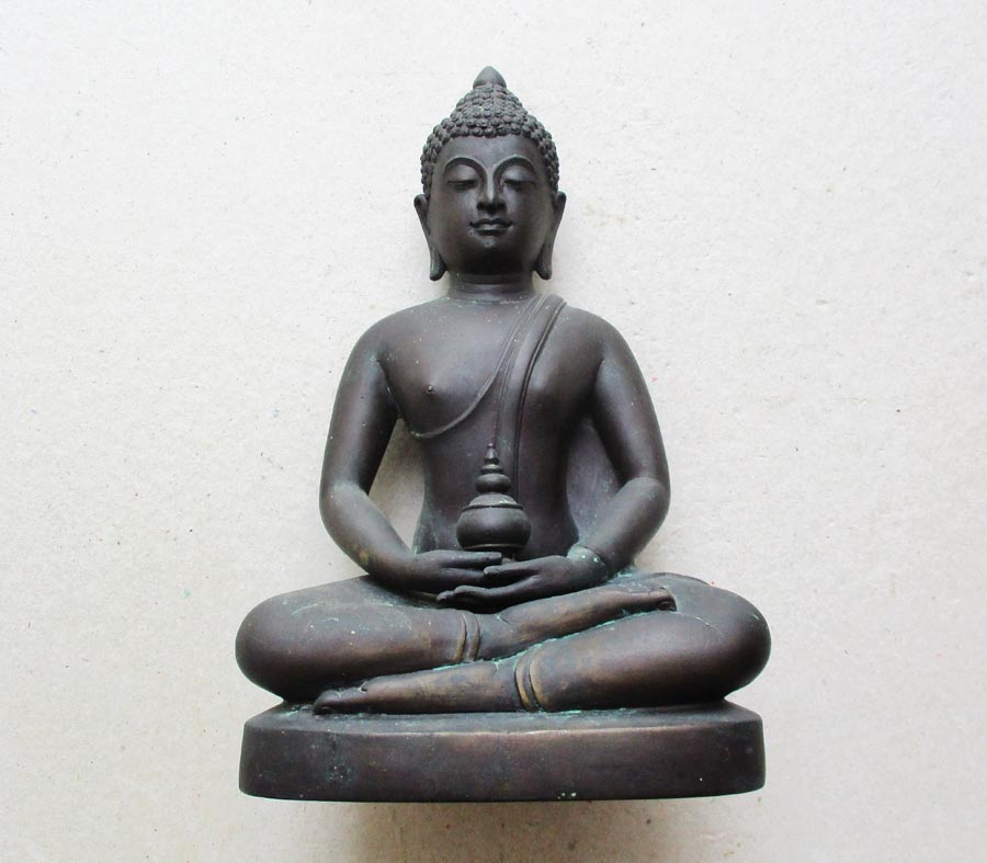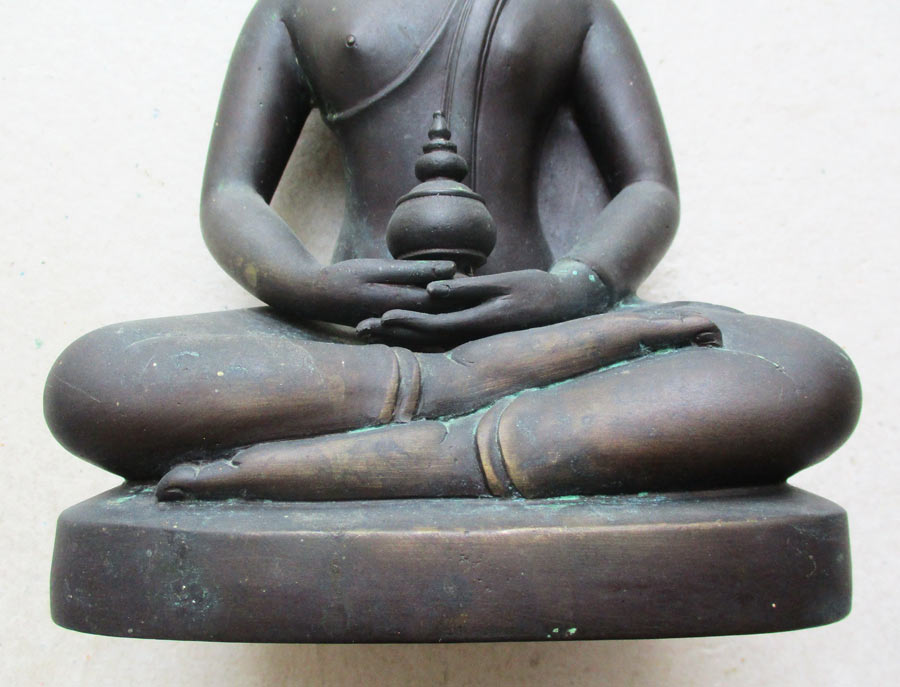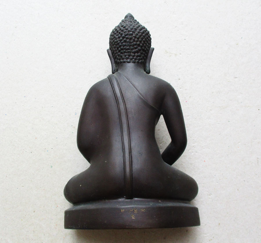 พระบูชา พุทธศิลป์ปางสมาธิถือบาตรครอบน้ำมนต์ เนื้อโลหะรมมันปู ผิวหิ้ง ตอก 3 โค๊ต มะอะอุ ตอกเลข ไม่ทราบวัด ?