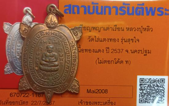 วัดใจ.....เคาะเดียวแดง เหรียญพญาเต่าเรือน หลวงปู่หลิว วัดไร่แตงทอง รุ่นสุขใจ เนื้อทองแดง ปี2537 จ.นครปฐม พร้อมบัตรรับรอง