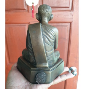 พระบูชาหลวงพ่อกวย พิมพ์ย้อนยุค ปี 2552 ขนาดหน้าตัก 5 นิ้ว ใต้ฐานมีเหรียญหลวงพ่อกวย ย้อนยุค ปี 2539