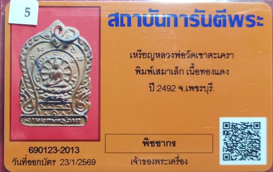 เหรียญเสมาเล็ก ลพ.วัดเขาตะเครา เนื้อทองแดง ปี2492 จ.เพชรบุรี พร้อมบัตรรับรอง |