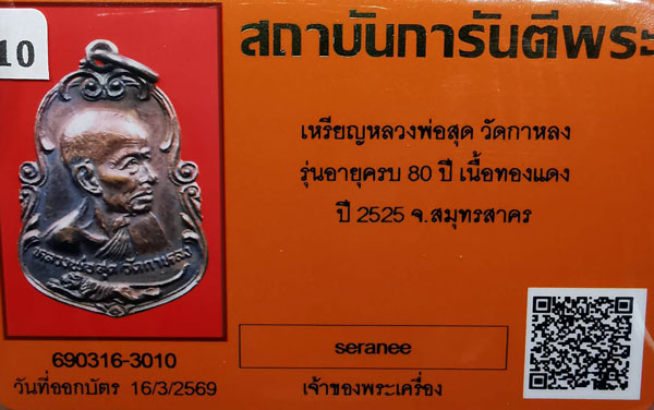 เหรียญหลวงพ่อสุด วัดกาหลวง รุ่นอายุครบรอบ80ปี(รางคู่) เนื้อทองแดง ห่วงเดิม ปี2525 จ.สมุทรสาคร + บัตรG-pra สภาพสวยเดิมค่ะ |