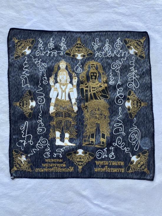 เคาะเดียวแดง ผ้ายันต์ พระพรหม พระนารายณ์ มิ่งมงคล รุ่นมงคลจักวาล ขนาด40/40ซม มีตราประทับ-มีรันเลข สีดำ |